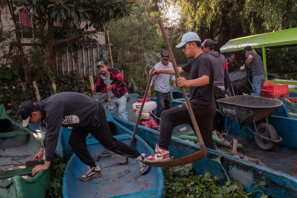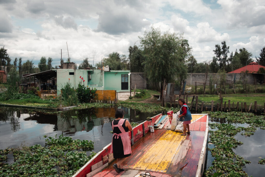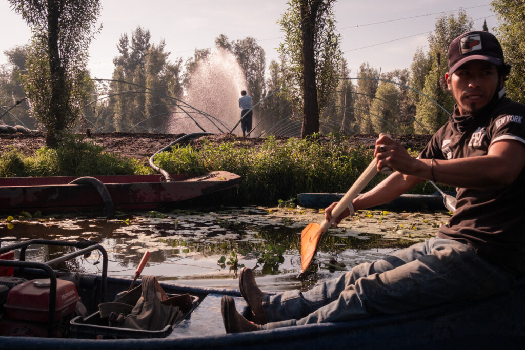 Still, signs of renewal emerge. At daybreak, workers from Arca Tierra paddle out with tools, pumps, and wheelbarrows. They lie on wooden boards to plant herbs such as cilantro, coriander, and parsley into grids of mud cut from the canal floor. Others guide flat bottom boats and kayaks piled with sacks of fertile soil, restoring plots row by row. “We can produce all year,” Joy explains. “If Xochimilco disappeared, the city could warm by two or three degrees.”