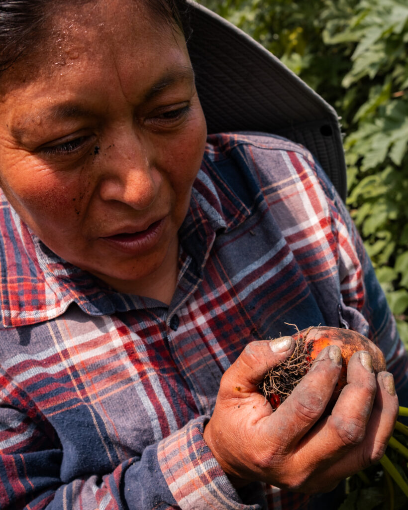 For those who remain, the work is more than survival. “Here, you breathe clean air,” says Lina López, holding a beetroot pulled fresh from the soil.