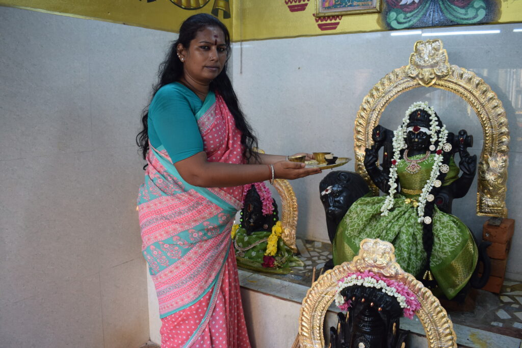 Every morning, in her crisp sari and gold bangles, Gopi wakes the goddess from her sleep, bathes her, and lights an oil lamp as a symbol of her divine presence. On Sundays, she sweeps the surroundings clean and waters the plants around it.