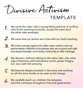 Both sides of the conflict are running the risk of making the very conflict they’d like to alleviate worse when using these secular activist methods – which are often adopted and practiced by religious advocates too. Secular activism adopts this “draw the line,” scapegoat-style methodology. They label the good guys and bad guys with no nuance. This is divisive activism, which is any kind of activism that divides humanity instead of unites it.